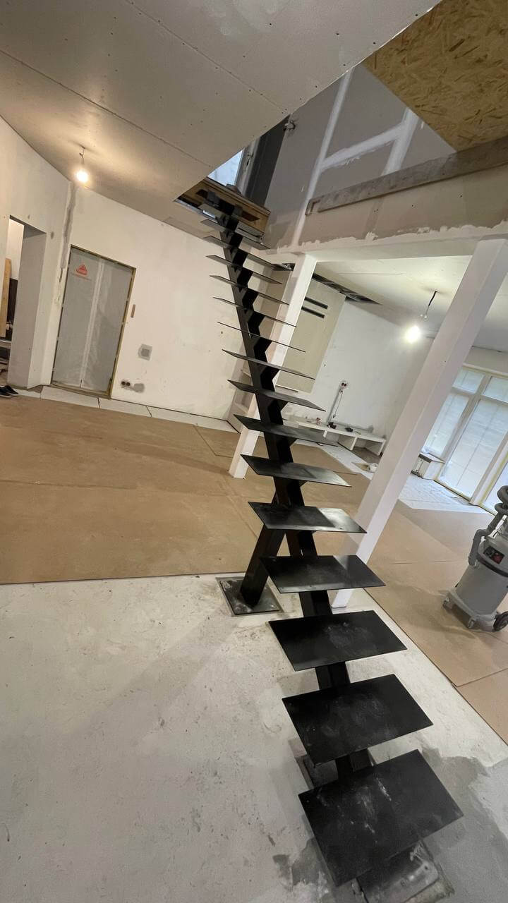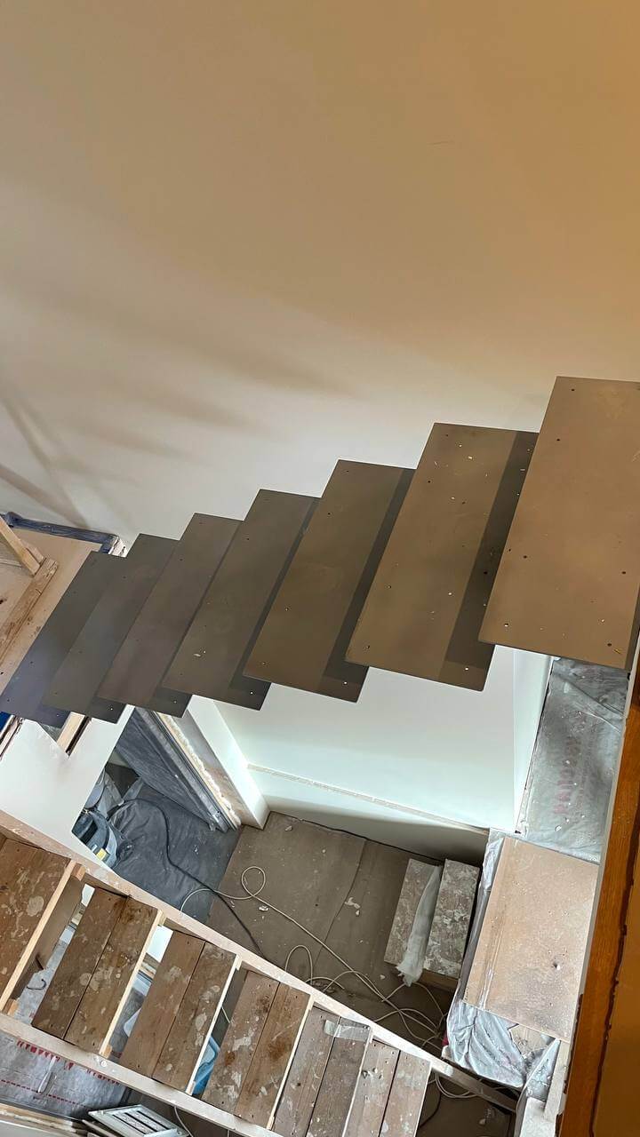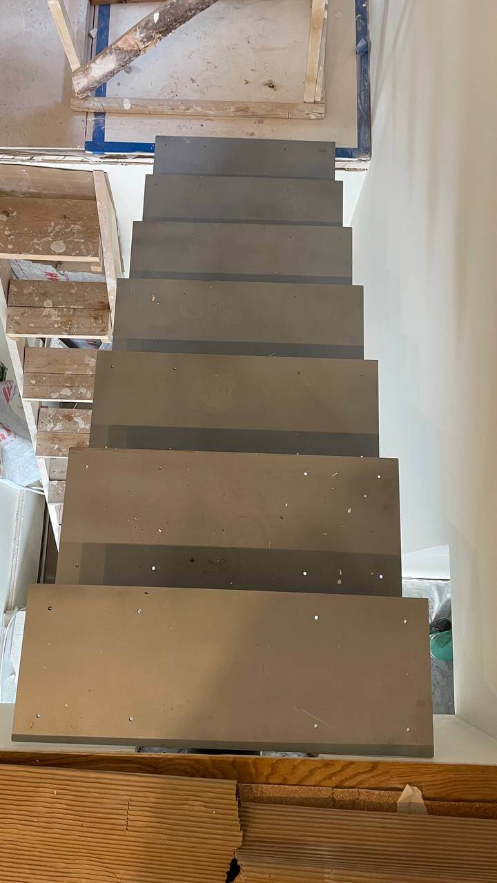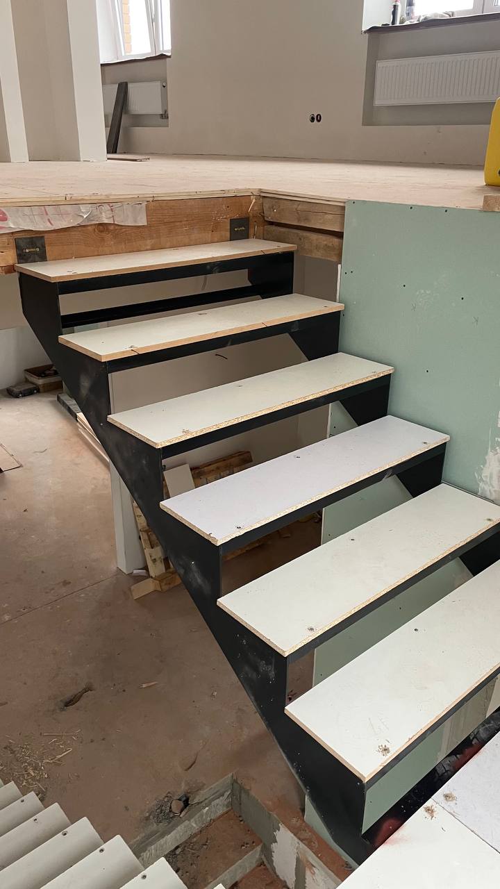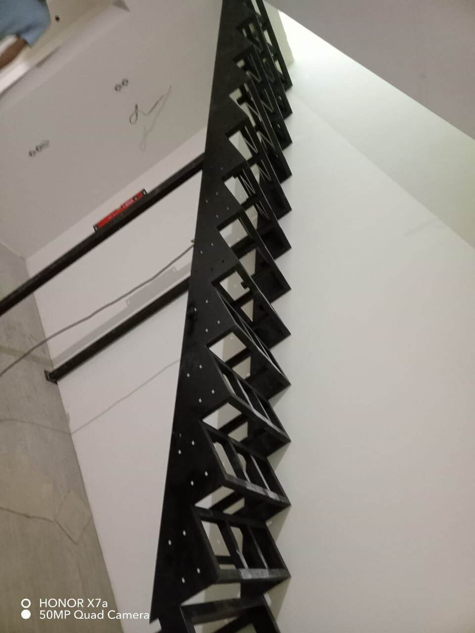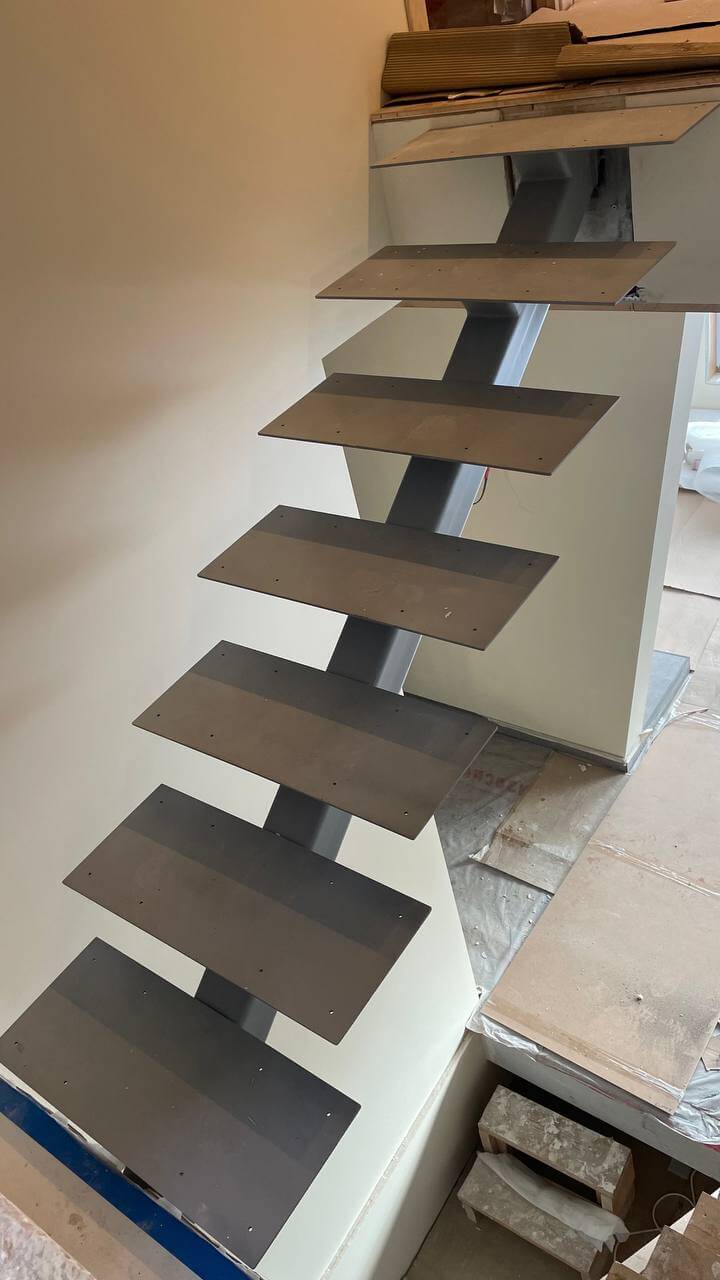 Металлокаркас открытого типа из листа - Косоур из листа гк 8мм, изготовленный лазерной резкой - С отверстиями под крепления ступеней - Покраска двух видов: грунт двухкомпонентный эмаль двухкомпонентная либо порошковая покраска